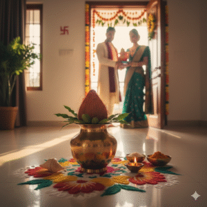 3. कलश स्थापना: तांबे के कलश में जल भरकर, उस पर नारियल और आम के पत्ते रखकर गृह प्रवेश करना अत्यंत मंगलकारी होता है।