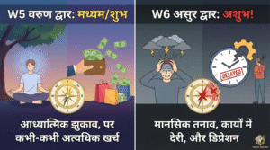 W5 (वरुण) – मध्यम/शुभ: यह द्वार व्यक्ति को आध्यात्मिक झुकाव देता है। यह शुभ है, लेकिन कभी-कभी यह अत्यधिक खर्चों का कारण भी बन सकता है।