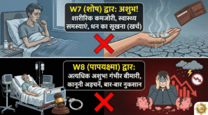W7 (शोष) – अशुभ: नाम के अनुरूप, यह द्वार शारीरिक कमजोरी, स्वास्थ्य समस्याएं और धन का सूखना (यानी जमा पूंजी खर्च होना) दर्शाता है।