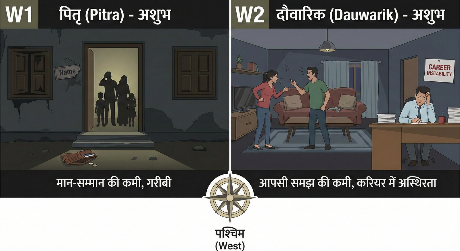 W1 (पितृ) – अशुभ: यहाँ द्वार होने से परिवार में मान-सम्मान की कमी आती है और यह धीरे-धीरे गरीबी की स्थिति पैदा करता है।